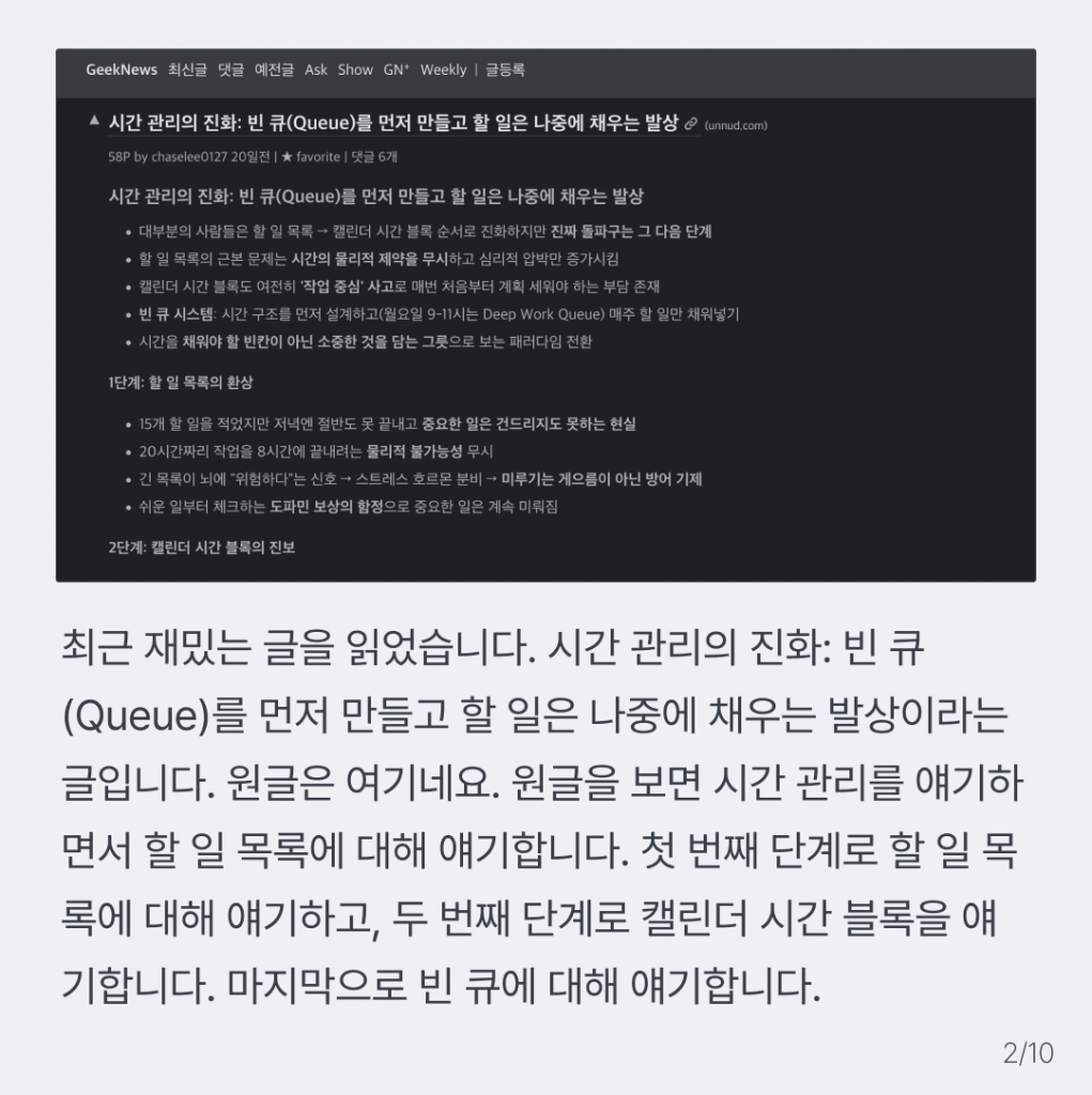 시간 관리의 진화: 빈 큐(Queue)를 먼저 만들고 할 일은 나중에 채우는 발상이라는 글입니다.