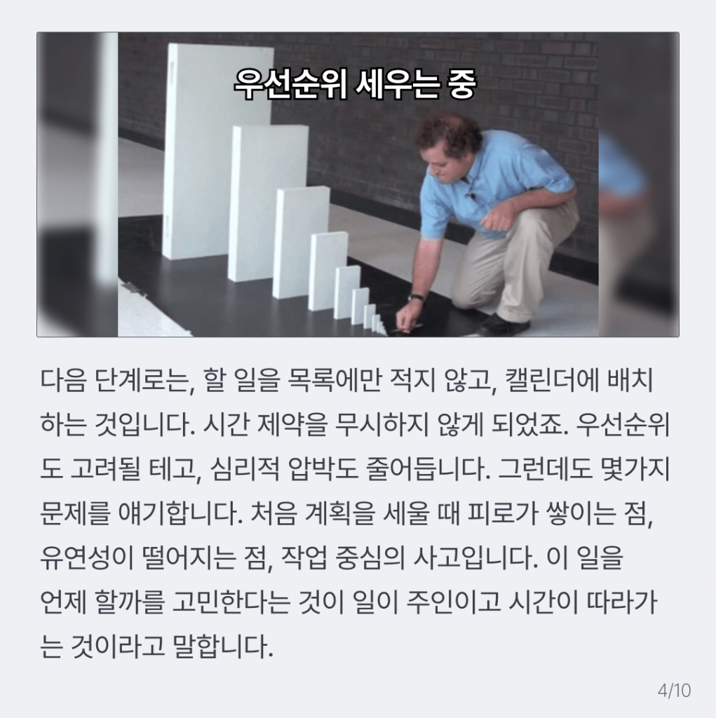 이 일을 언제 할까를 고민한다는 것이 일이 주인이고 시간이 따라가는 것이라고 말합니다.