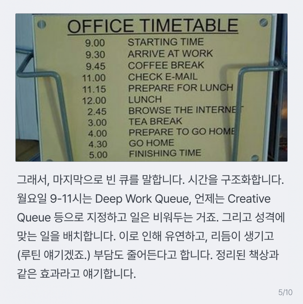 시간을 구조화합니다. 월요일 9-11시는 Deep Work Queue, 언제는 Creative Queue 등으로 지정하고 일은 비워두는 거죠.