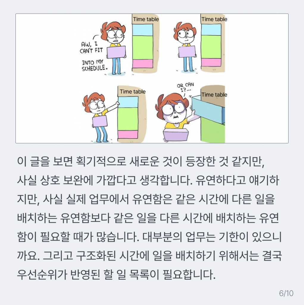 유연하다고 얘기하지만, 사실 실제 업무에서 유연함은 같은 시간에 다른 일을 배치하는 유연함보다 같은 일을 다른 시간에 배치하는 유연함이 필요할 때가 많습니다.